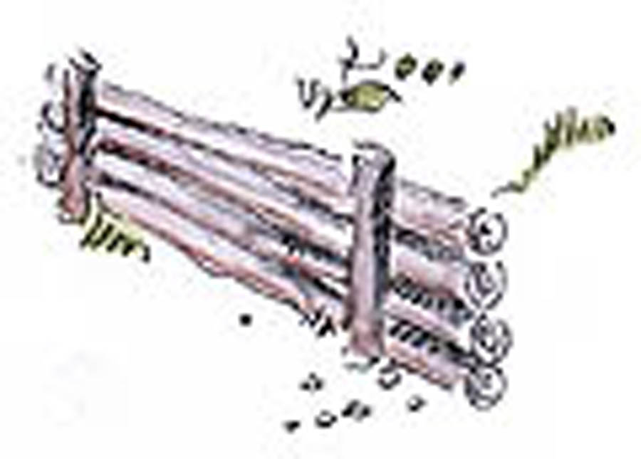 Stämme von Robinien ("Akazien"), übereinandergelegt und mit Rundhölzern oder zwischen Bäumen abgestützt