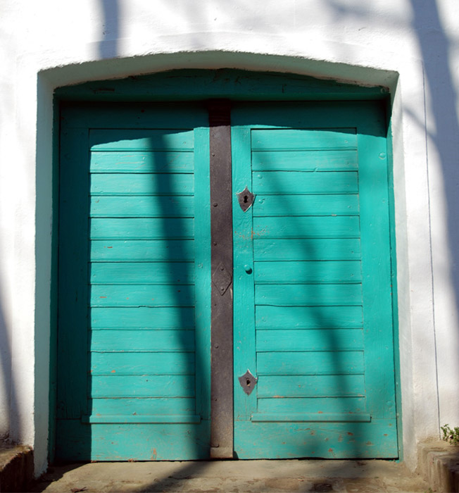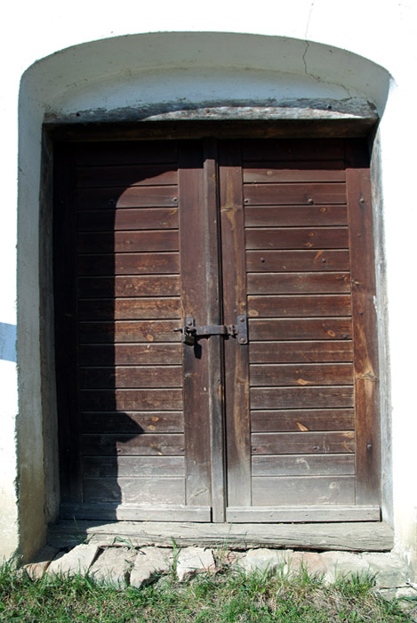Neue Türen müssen sehr schlicht und mit möglichst alten Beschlägen zweiflügelig ausgeführt werden. Am Besten man nimmt sich alte Türen zum Vorbild. „Gefräste Sonnenmuster“ sind völlig falsch. Die Oberfläche ist grün zu streichen oder dunkel zu beizen.